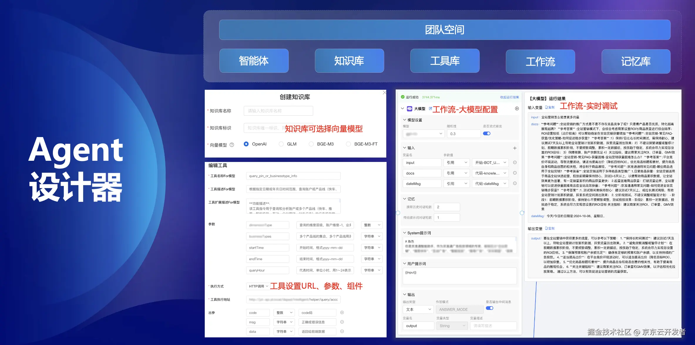 Agent引擎: 主要是根据设计器产生的配置,动态运行工作流程,如:知识的召回、提示词的加工、模型的推理、工具的调用、代码的执行等等。