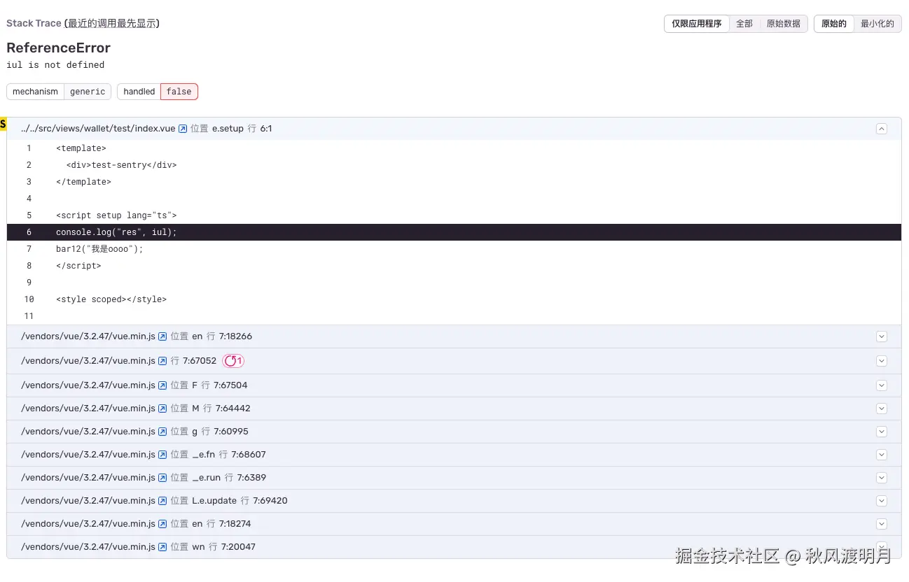 此时当执行vite build时,viteSentry这个插件会根据你init配置,以及release的设置,将构建的sourcemap文件上传到sentry对应的项目-release之下。当次版本新捕获到错误时就可以还原出错误行,以及详细的错误信息