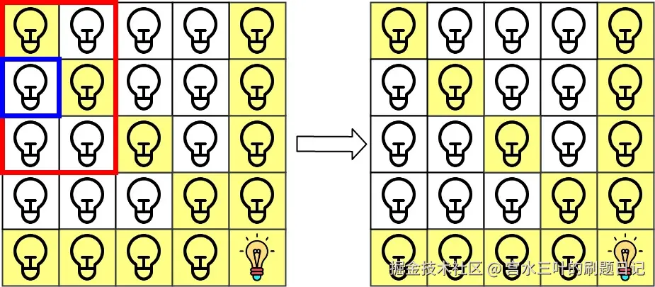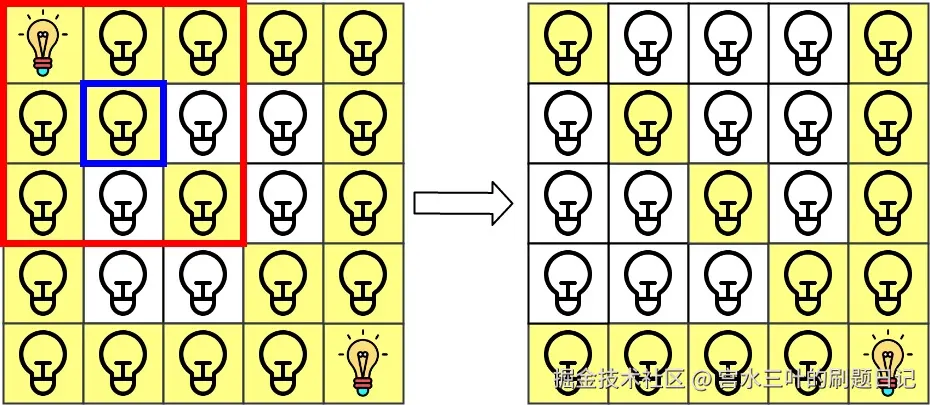 同时,由于每次查询后要进行「灭灯」操作(注意:灭灯只能灭有灯的位置,而不是灭有光的位置 🤣),因此我们还需要另外记录每个灯的位置,可以使用利用「二维转一维」的技巧进行编号:,并使用 HashSet 进行记录(忽略重复的 )。