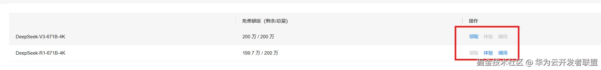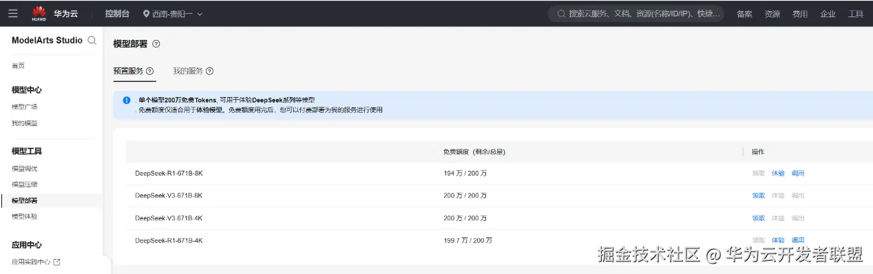 步骤二:领取免费额度。 点击“模型部署”,在“预置服务”里选择对应的模型,领取200万Tokens额度。注:region选择贵阳一,可直接进行Deepseek-R1/V3(满血版)体验。
