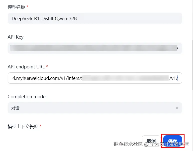 在华为云ModelArts Studio中领取DeepSeek-R1-Distill-Qwen-32B模型免费token额度,并将模型接入Dify中。