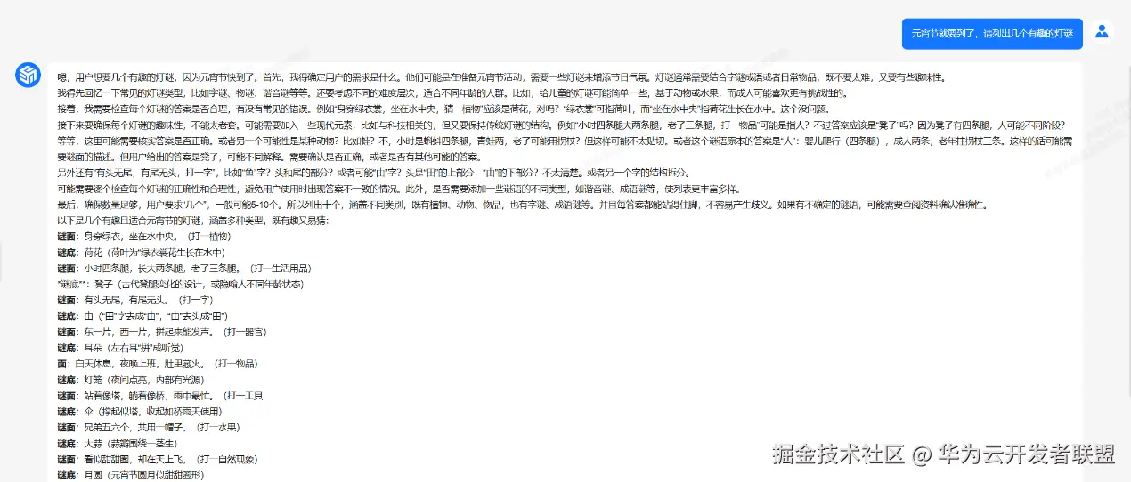 值此元宵节之际,基于上面提到的通过华为云体验DeepSeek的方式,开发者可以生成独具个性的元宵节灯谜/祝福语,欢度技术节~