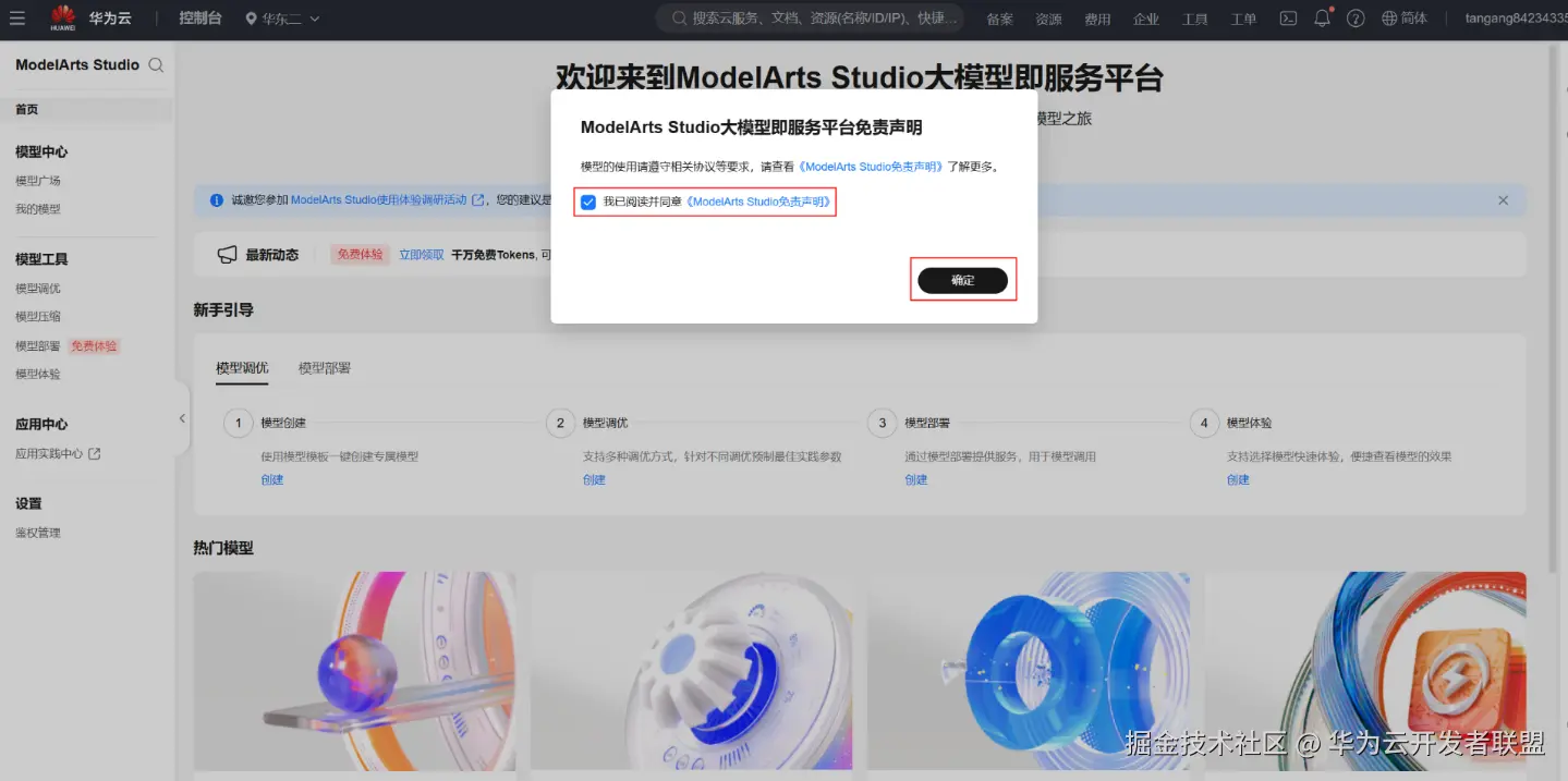 步骤一:注册/授权MaaS平台。点击下方链接登录 华为云账号后进入MaaS,签署免责声明,进行服务授权。