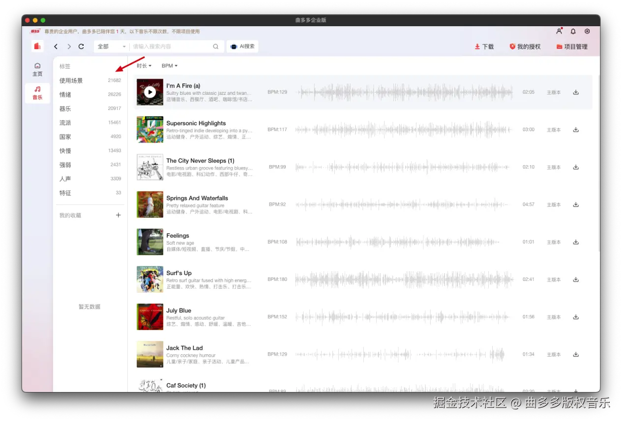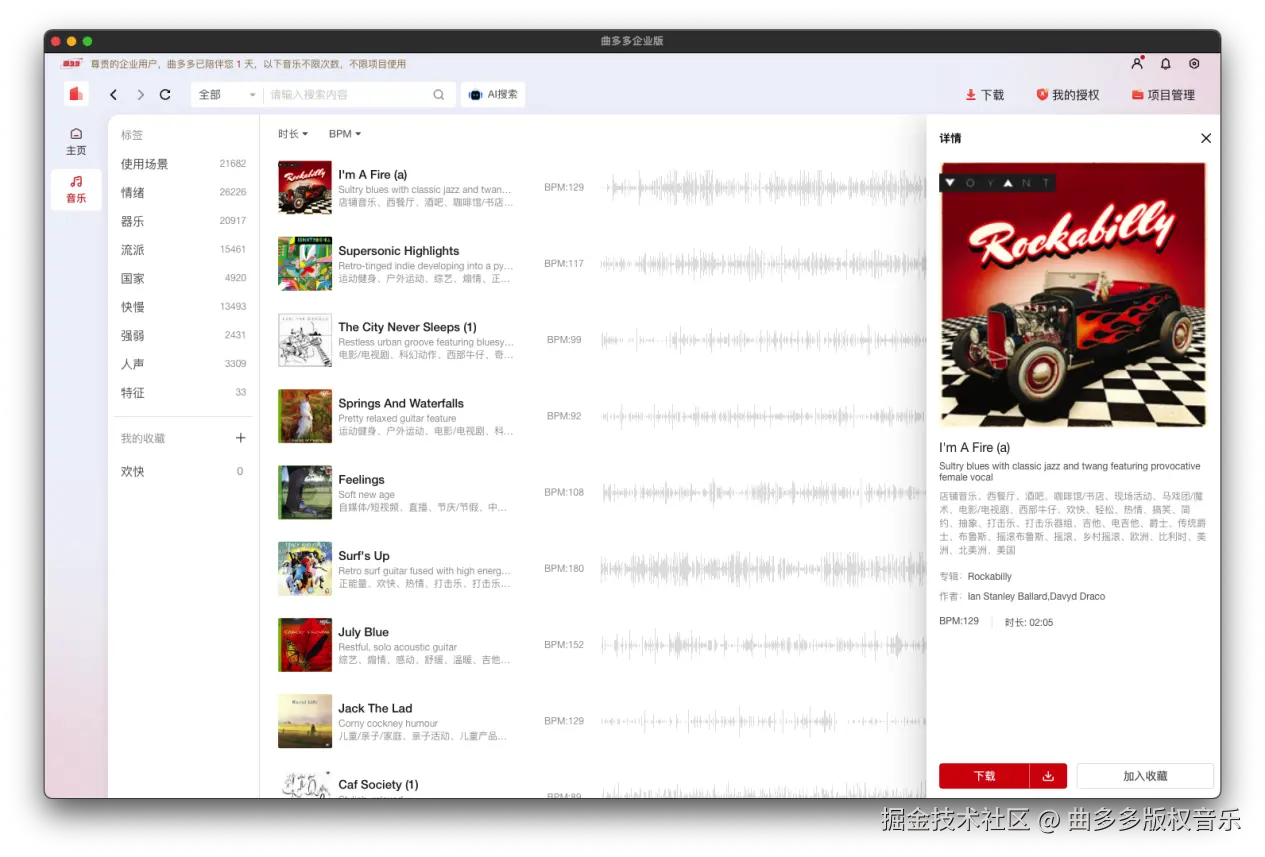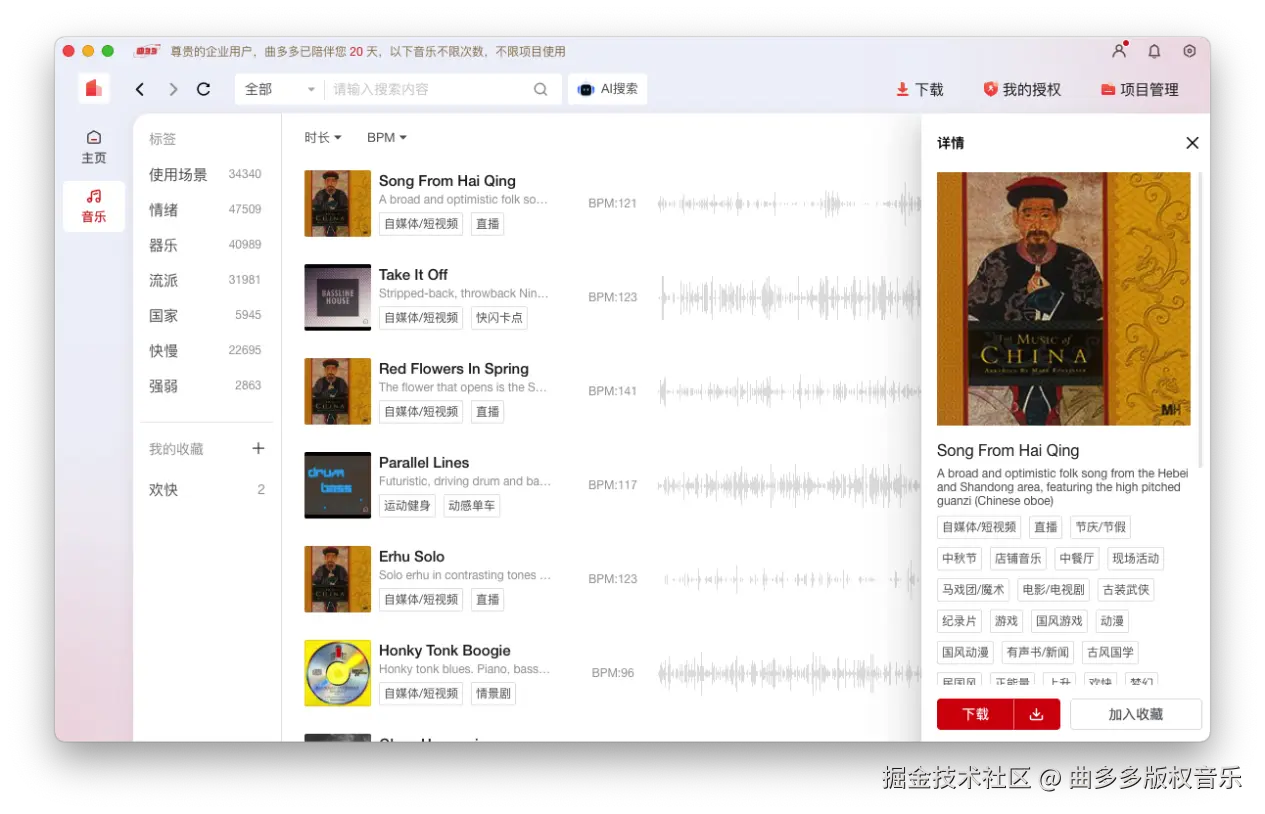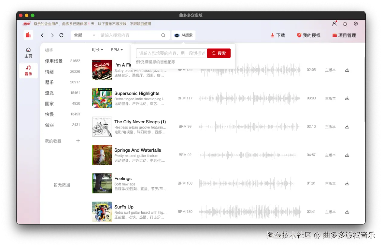 曲多多客户端凭借丰富功能和便捷操作,成为获取商用音乐素材的得力助手。无论是个人创作者寻找契合作品风格的 BGM,还是企业团队为项目挑选适配的商用音乐,都能在曲多多客户端找到满足需求的音乐解决方案。在这里,海量正版音乐素材任你挑选,让你轻松开启高效创作之旅,为作品注入灵动音符,助力每一次创意表达。欢迎前往曲多多(agm.haifanwu.com ),体验百万级全球化版权曲库带来的丰富选择,享受便捷的正版音乐授权服务!