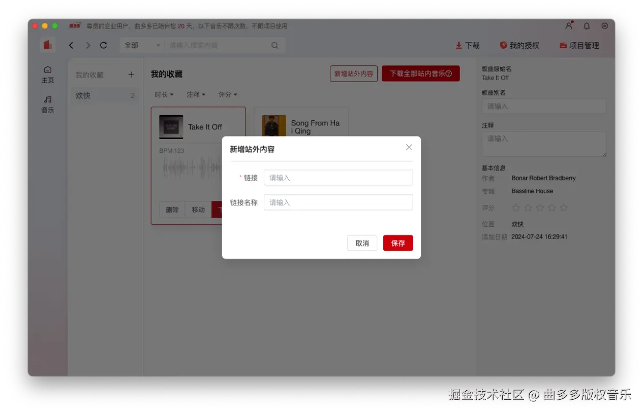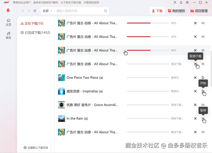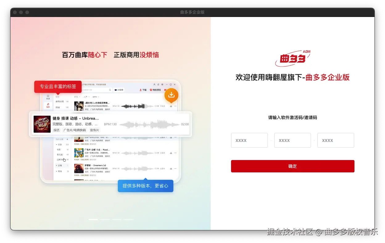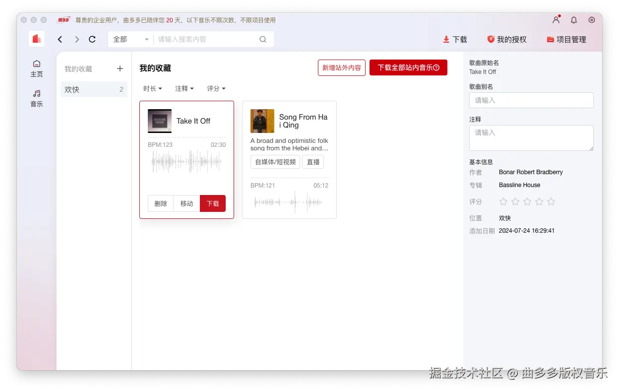 曲多多客户端凭借丰富功能和便捷操作,成为获取商用音乐素材的得力助手。无论是个人创作者寻找契合作品风格的 BGM,还是企业团队为项目挑选适配的商用音乐,都能在曲多多客户端找到满足需求的音乐解决方案。在这里,海量正版音乐素材任你挑选,让你轻松开启高效创作之旅,为作品注入灵动音符,助力每一次创意表达。欢迎前往曲多多(agm.haifanwu.com ),体验百万级全球化版权曲库带来的丰富选择,享受便捷的正版音乐授权服务!