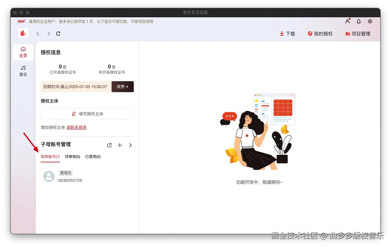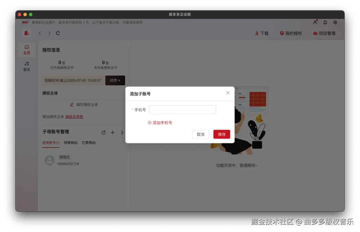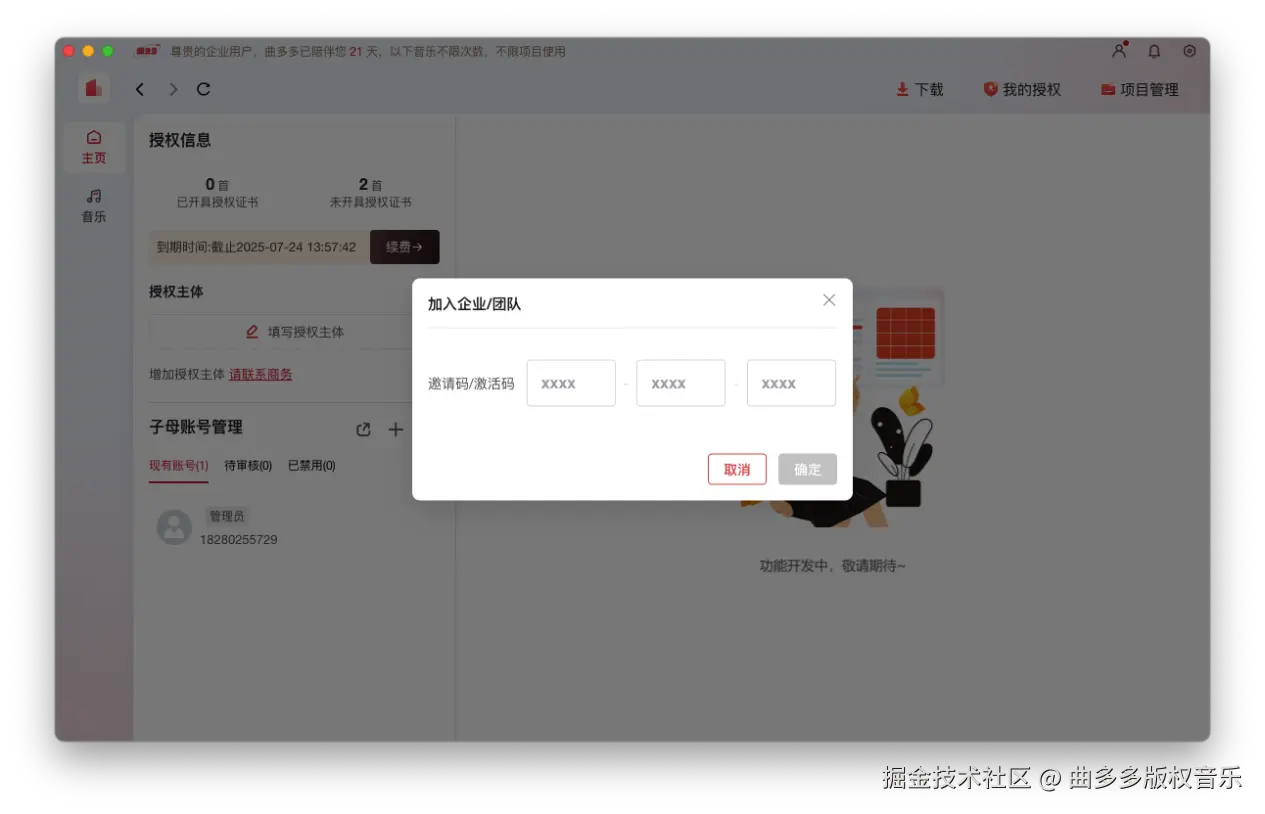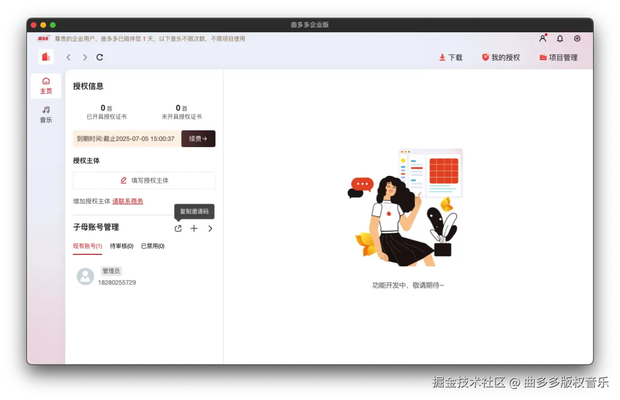 - 已完成下载操作权限:全部角色可对已完成下载音乐进行搜索、授权、加入项目、重新授权、导出下载记录、设置默认目录、查看授权证书操作。母账号可查看所有人下载记录、授权和加入项目、导出全量记录;子账号仅能查看自身记录。
