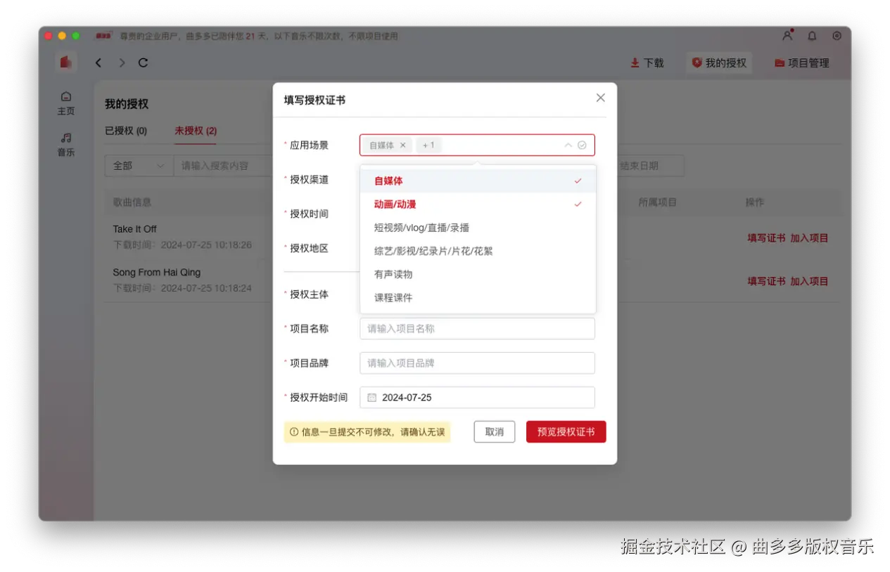 - 批量授权操作:可批量开具授权证书,对于拥有多个项目或大量音乐需求的用户,节省逐个申请授权的时间和精力,高效完成授权流程。