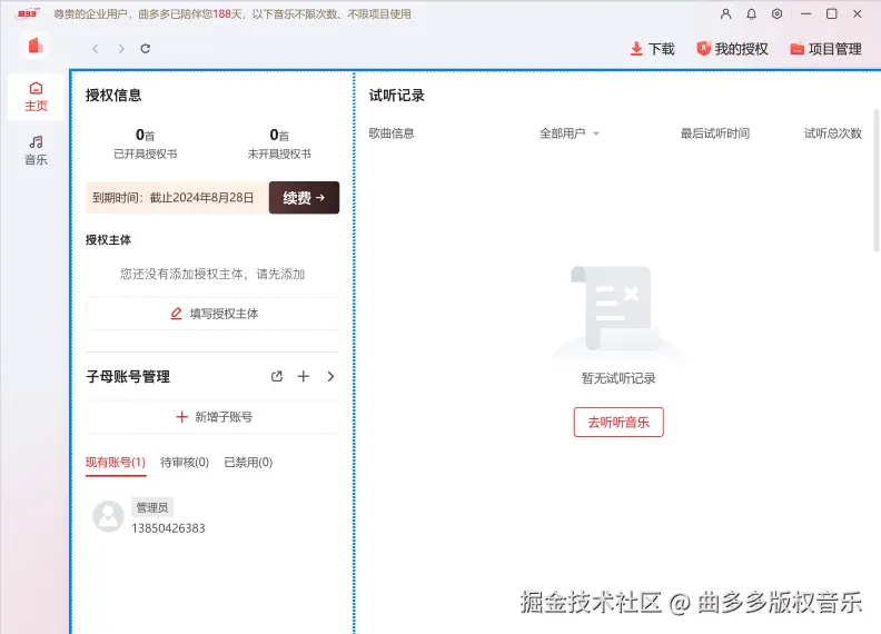 - 试听记录追溯:母账号可查看全部子账号试听记录,了解团队音乐喜好和需求趋势,辅助选曲决策。