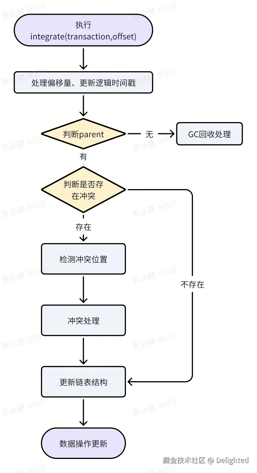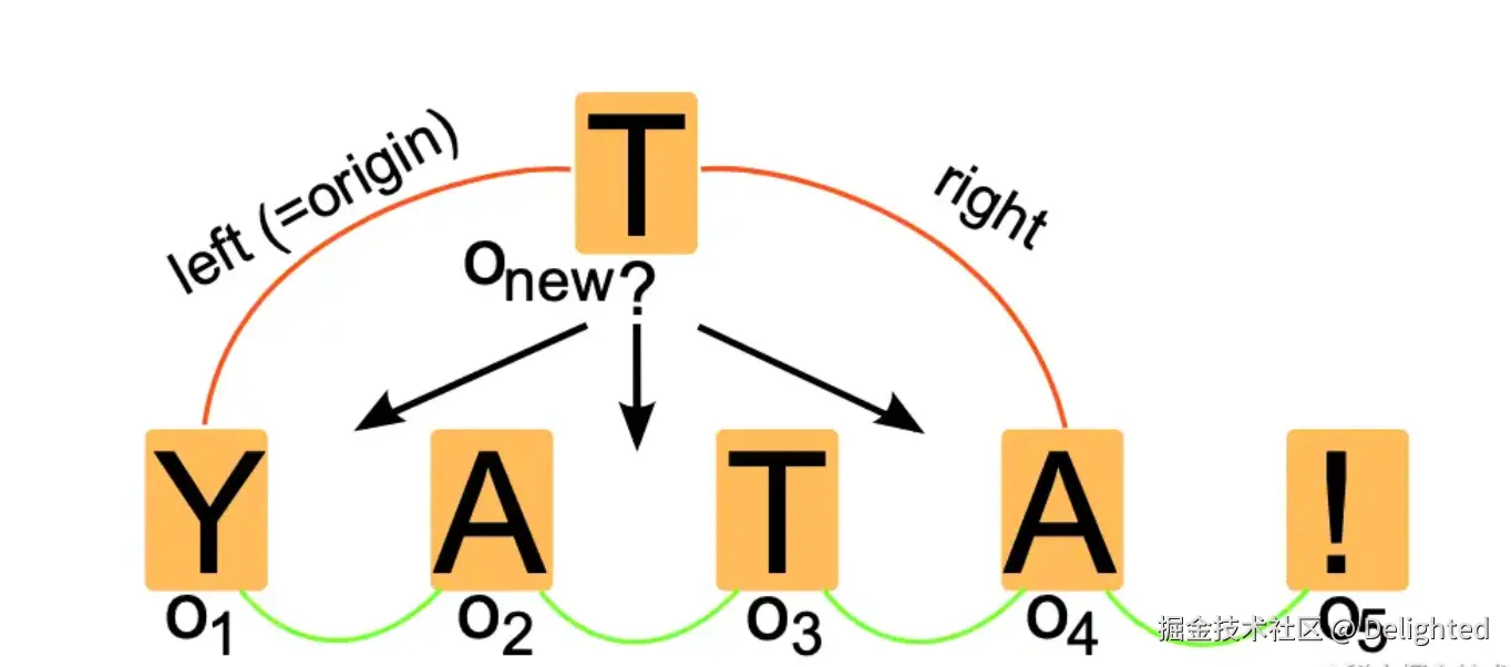 Y A T A ! 这几个字符每个都对应一个 item(或者说一次字符插入的 operation)。它们通过 left 和 right 字段连接在一起。在插入新字符 T 的时候,Yjs 就会根据 item 的 ID(逻辑时间戳) 在链表中查找合适的插入位置,将新字符对应的 item 接入链表中。 接下来根据源码来看integrate(transaction,offset)是如何实现?