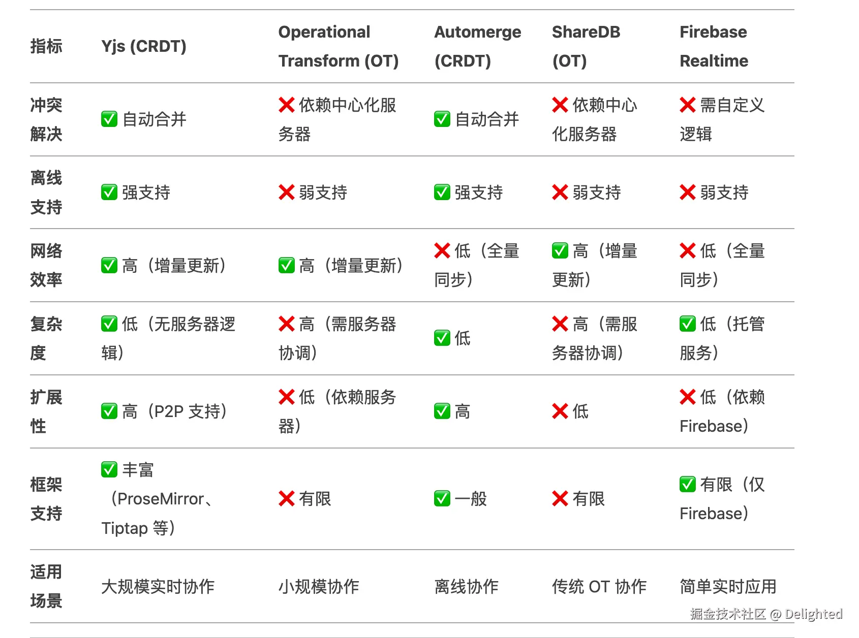 Yjs 结合了 CRDT 的自动合并能力、去中心化架构和高效增量同步,解决了传统 OT 方案对中心化服务器的依赖和冲突处理的复杂性,同时提供了强大的离线支持和扩展性,完美契合现代分布式协作应用的需求,因此成为主流选择。