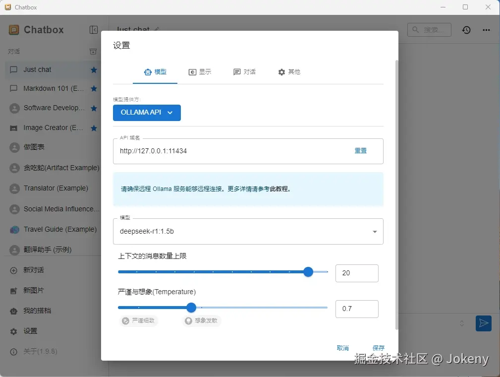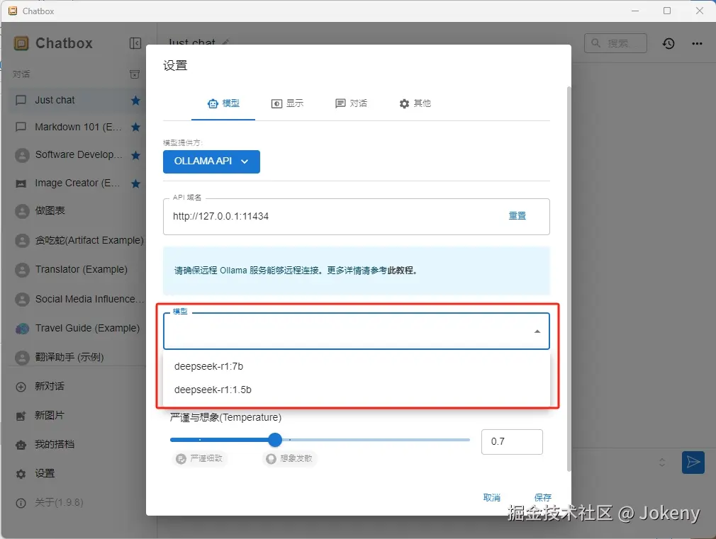 选择“Ollama API”,接着在下拉菜单里找到之前安装好的“deepseek-r1:1.5b”模型,点击保存,搞定!