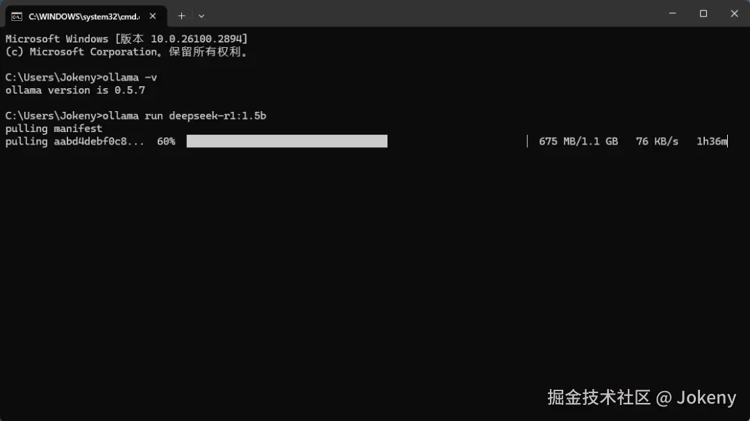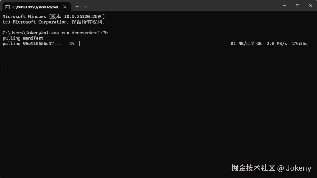 如果想要安装其他版本的模型,可以在命令提示符中重新输入下载命令,我这里安装了“DeepSeek-R1 7B模型”,大概三十分钟左右(具体还得看网速),如下图: