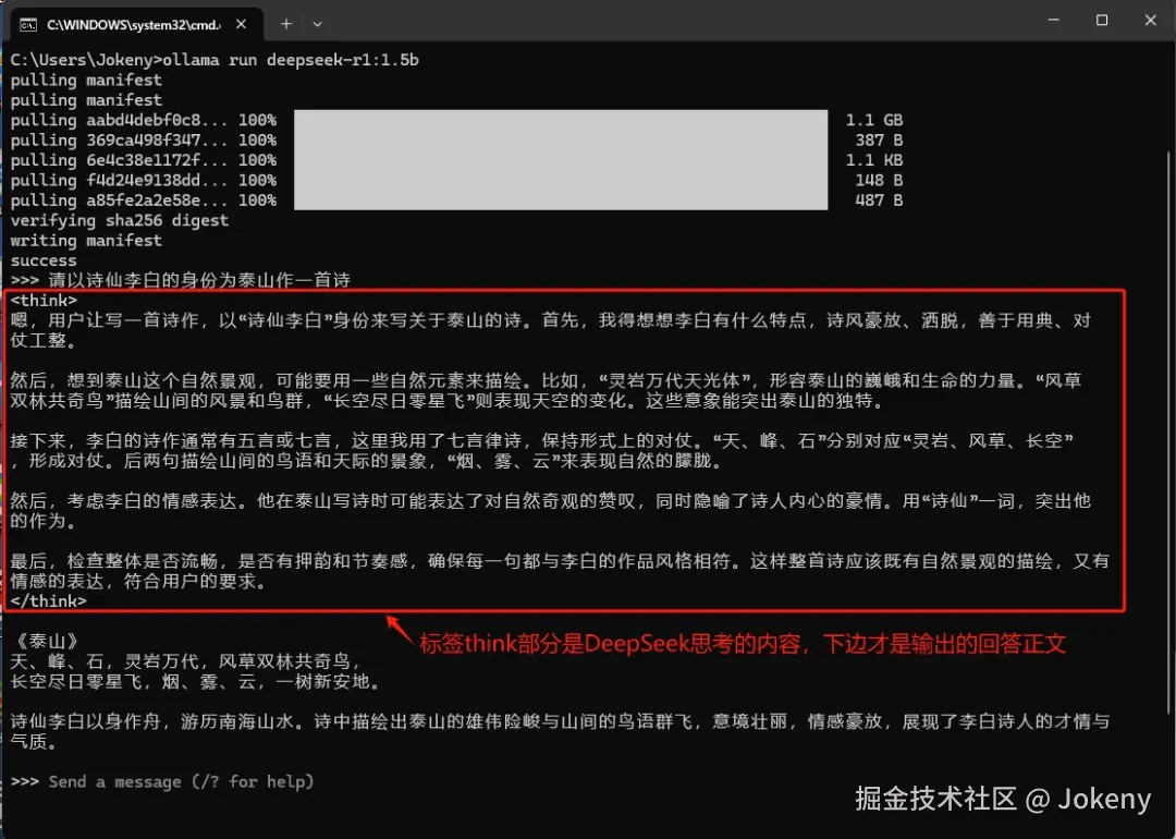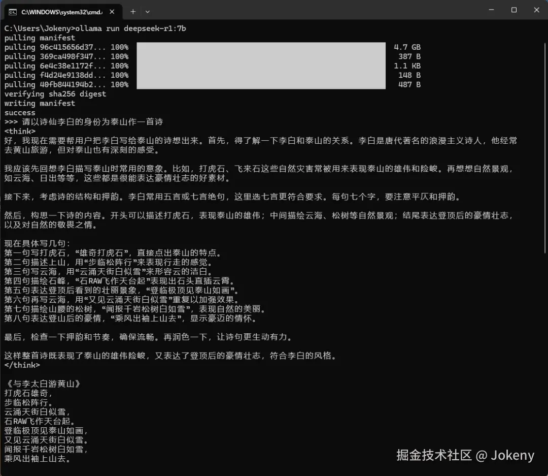 这里以“DeepSeek-R1 1.5B模型”为例,输入“请以诗仙李白的身份为泰山作一首诗”,运行结果如下: