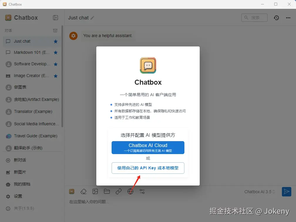 安装完成后,首次启动时,系统会提示你添加模型,点击【使用自己的 API Key或本地模型】按钮