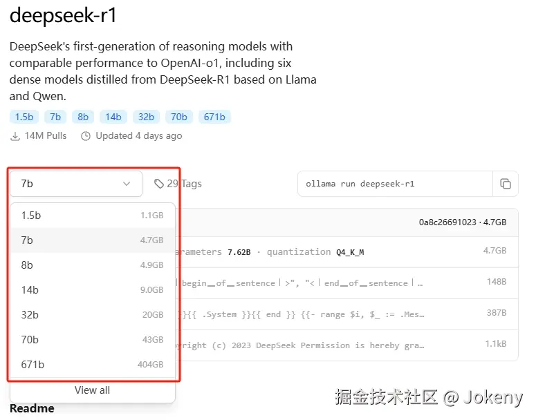 搞定 Ollama 后,就该下载 DeepSeek 模型了。在 Ollama 网站的“Models”页面,找到“DeepSeek”模型,它有从 1.5B 到 671B 不等的多个参数规模可供选择,大家一定要根据自己的电脑配置,尤其是内存和显存,来挑选合适的模型规模。