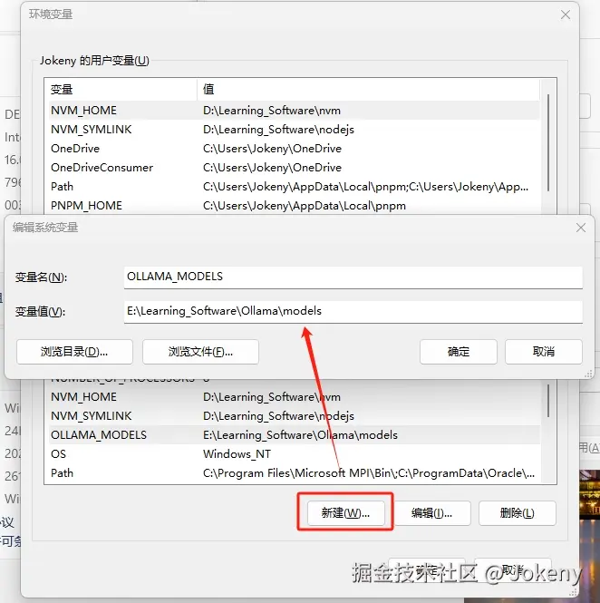 在【环境变量】窗口中,【系统变量】下点击【新建】按钮,输入变量名 “OLLAMA_MODELS”,变量值为新创建的目录路径,例如 “E:\Learning_Software\Ollama\models”,具体如下图:
