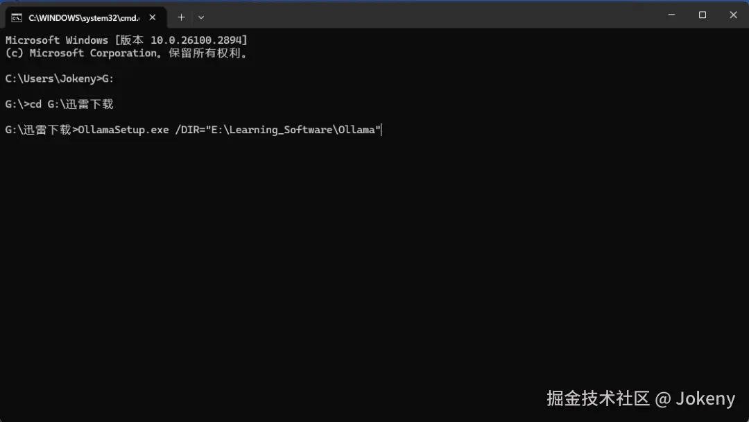 先使用命令提示符导航到保存“OllamaSetup.exe”文件的目录,再输入以下命令来指定安装路径:
