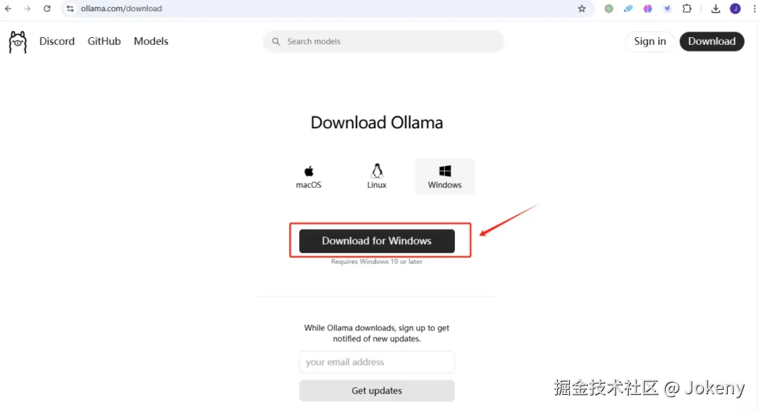 点击【Download for Windows】按钮,开始下载 Ollama 的安装包。