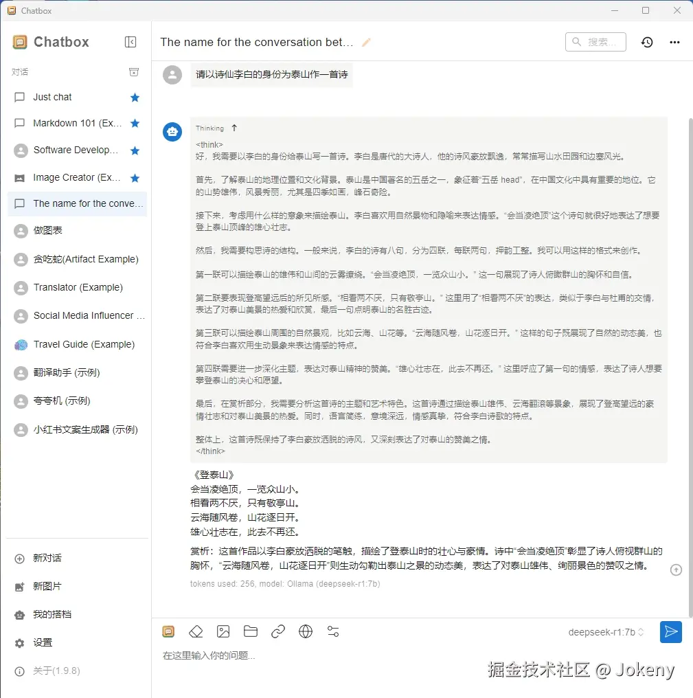 选择“deepseek-r1:1.5b”模型,输入“请以诗仙李白的身份为泰山作一首诗”,运行结果如下: