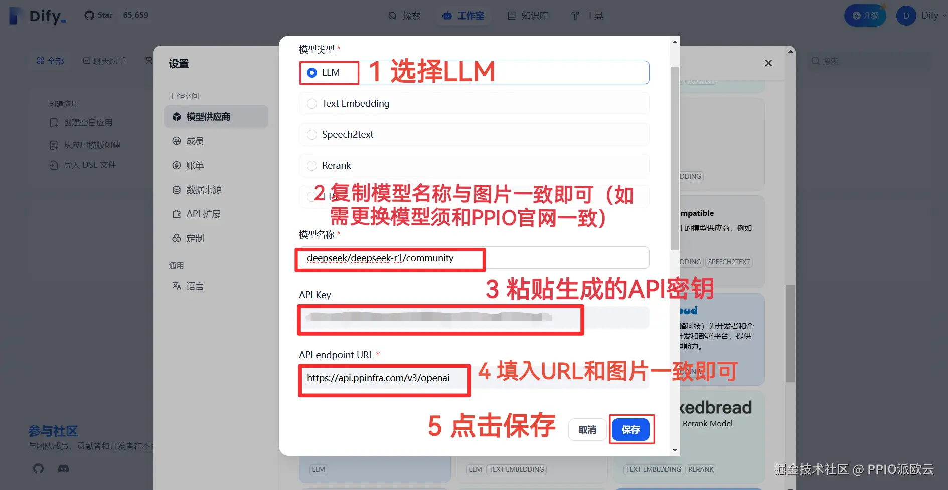下方教程包含完整接入方案(含密钥配置),3 分钟开启「Dify 智能调度 + PPIO 高性能 API」的进阶模式 ▶