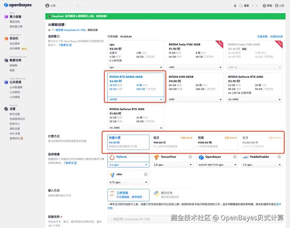 - 选择「NVIDIA RTX A6000」以及「PyTorch」镜像,OpenBayes 平台上线了新的计费方式,大家可以按照需求选择「按量付费」或「包日/周/月」,点击「继续执行」。新用户使用下方邀请链接注册,可获得 4 小时 RTX 4090 + 5 小时 CPU 的免费时长!