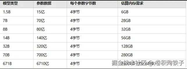 一般来说,DeepSeek-R1模型中的每个参数占用4个字节(32位)。这个值相对固定,常用于大多数深度学习模型。通过这个假设,我们可以计算出每个版本大致需要多少内存。
