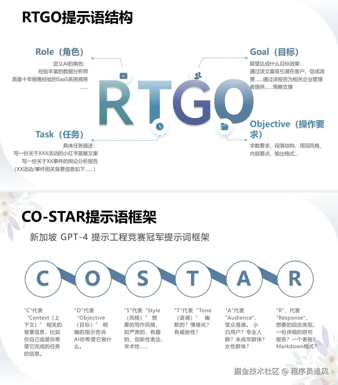 **RTGO结构:**定义角色(Role)、任务(Task)、目标(Goal)、操作要求(Objective),适用于精准任务。
