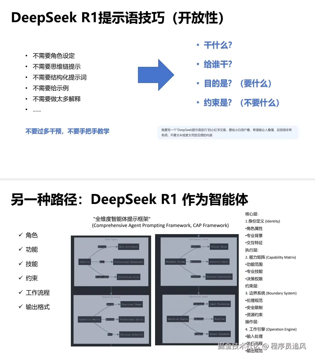 **避免过度干预:**R1模型无需详细步骤,只需明确“目标、受众、约束”即可激发AI潜力。