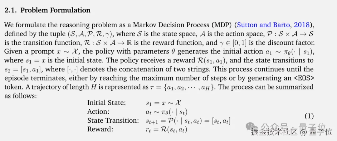 他们将推理问题建模为马尔可夫决策过程,定义了状态空间、动作空间、转移函数、奖励函数和折扣因子等元素。