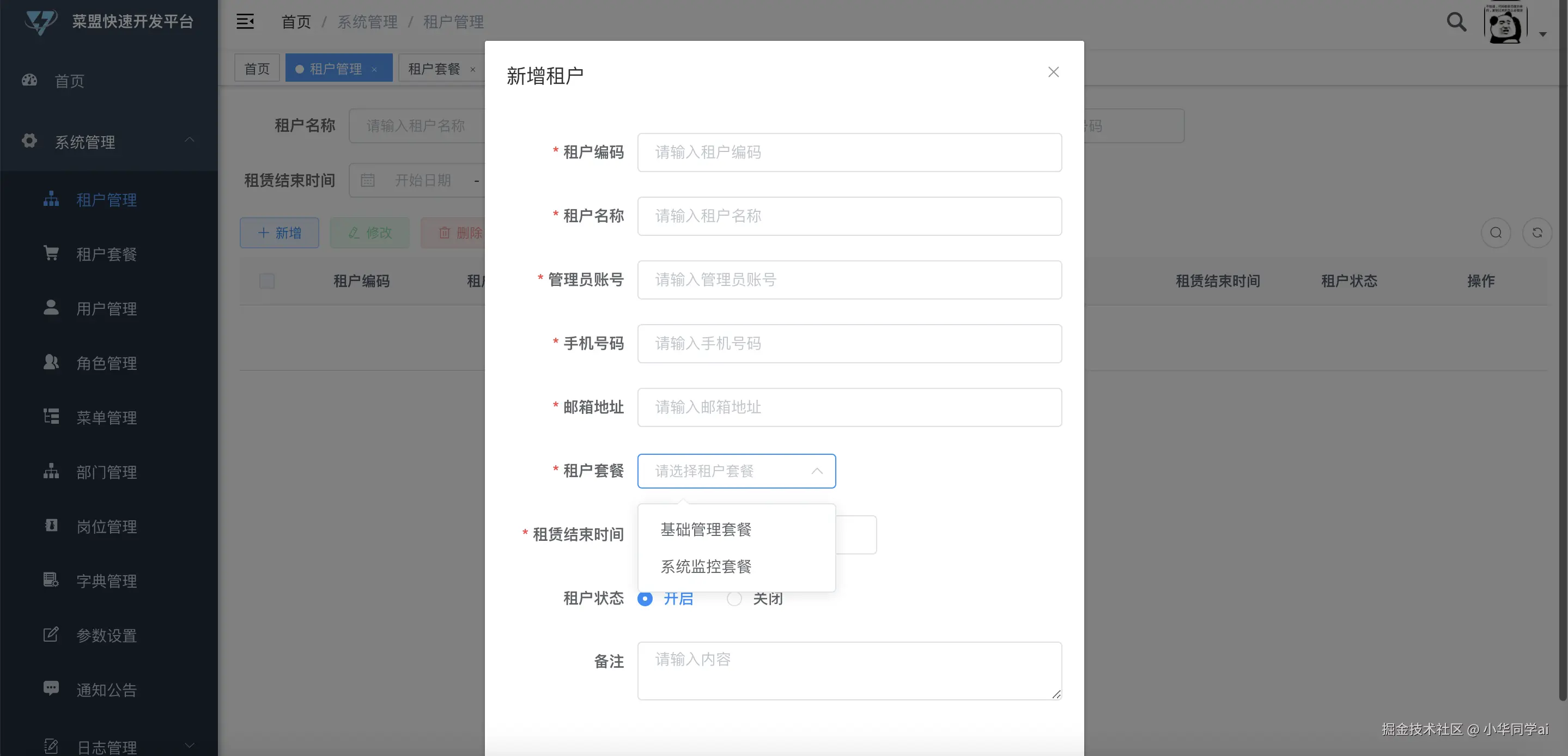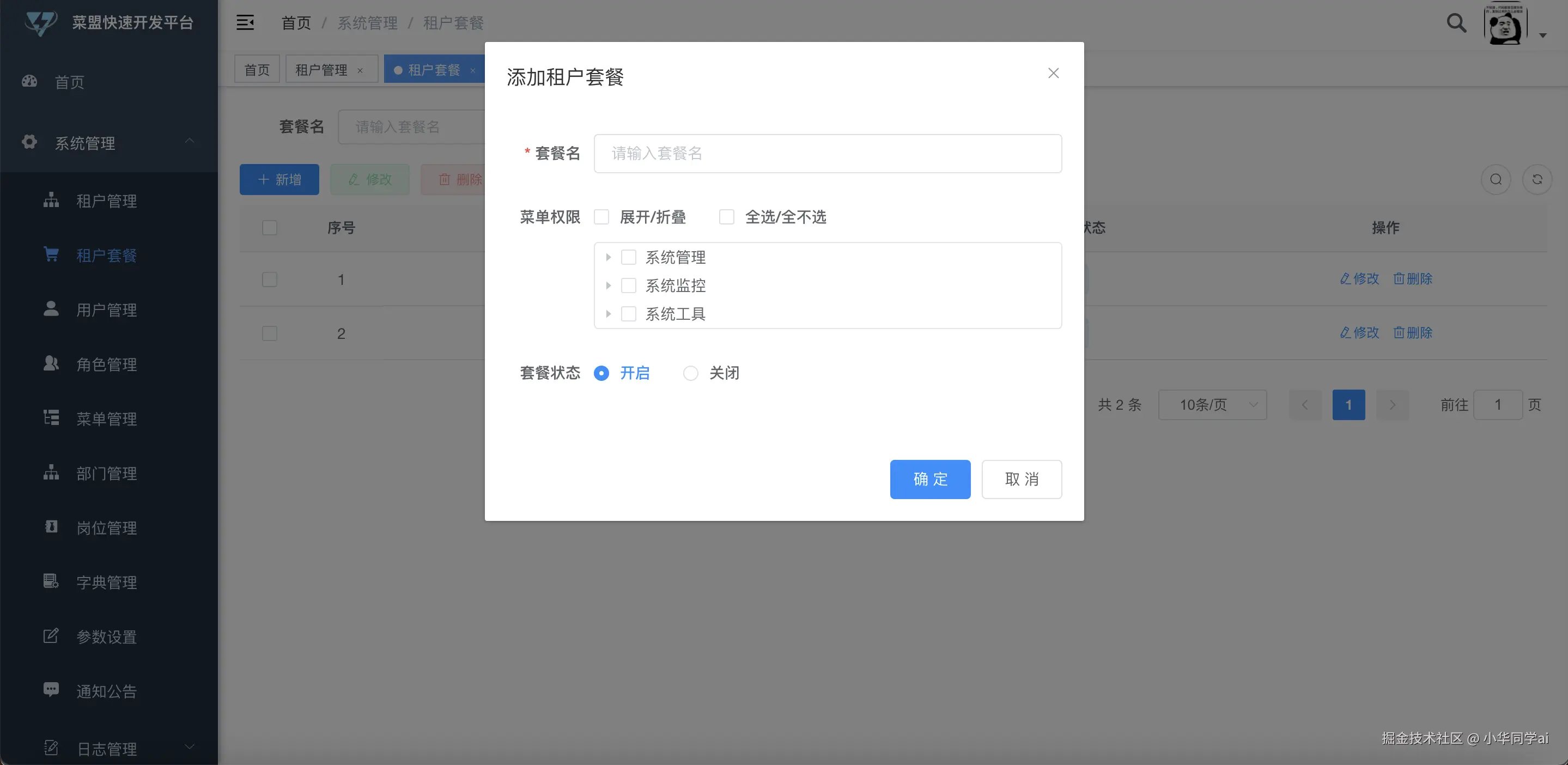 - 菜单管理:动态菜单配置,支持多级菜单嵌套