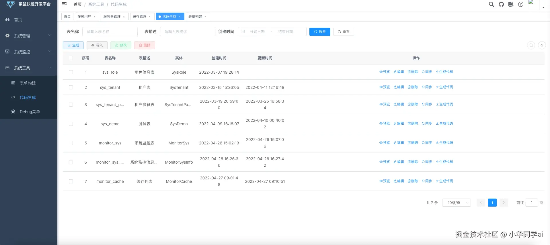 - 代码生成:一键生成前后端代码,提升开发效率