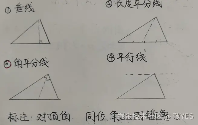 小窍门:学习几何就要学会画辅助线,比如延长线、平行线、垂线等 先找内错角,再找同位角,最后找对顶角。这样一来,不管是多难的图形题,你都能找到灵感。