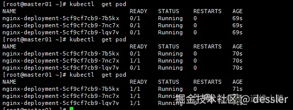 3.容器启动以后,60秒以后才开始执行健康检查逻辑,因为有的程序启动需要比较长的时间,第一次执行60+10执行,未执行健康检查之前pod的状态都是0/1,执行成功以后都才会变成1/1。