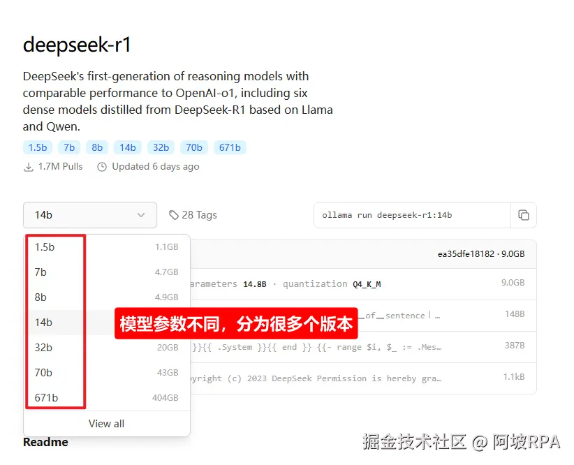 可以看到模型有根据参数分为1.5b,7b,8b,14b,32b,70b,671b等,我们需要根据自己电脑选择下载对应参数的模型。