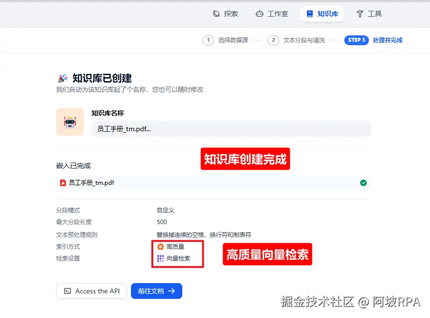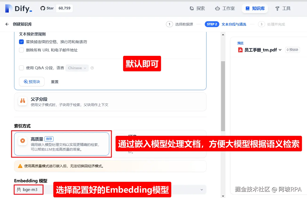我们上传的资料要通过Embedding模型转换为向量数据存入向量数据库,这样回答问题时,才能根据自然语言,准确获取到原始数据的含义并召回,因此我们需要提前将私有数据向量化入库。
