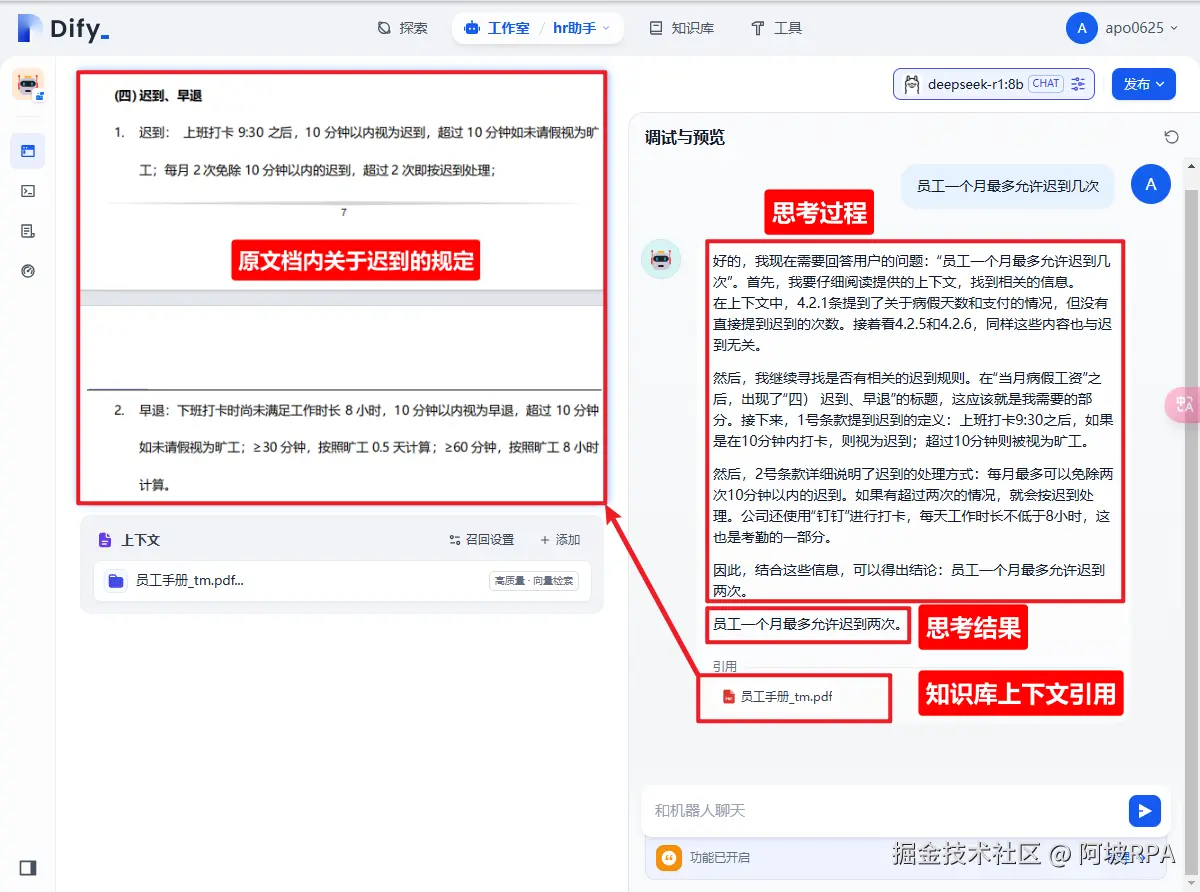 如果感觉回答的效果还不满意,可以对召回参数进行调整,或者可以参考官方文档,做其他详细设置:docs.dify.ai/zh-hans/gui…