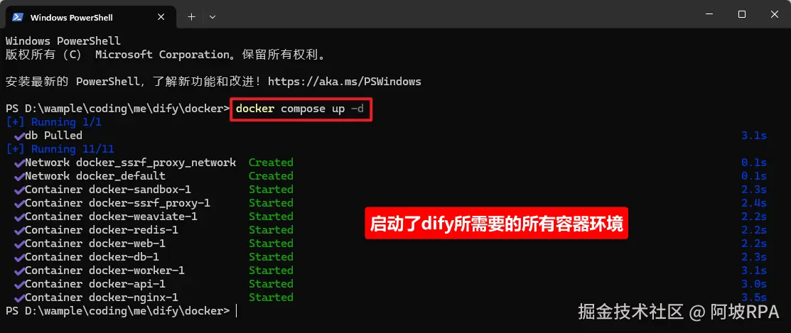 此时回到docker桌面客户端可看到,所有dify所需要的环境都已经运行起来了