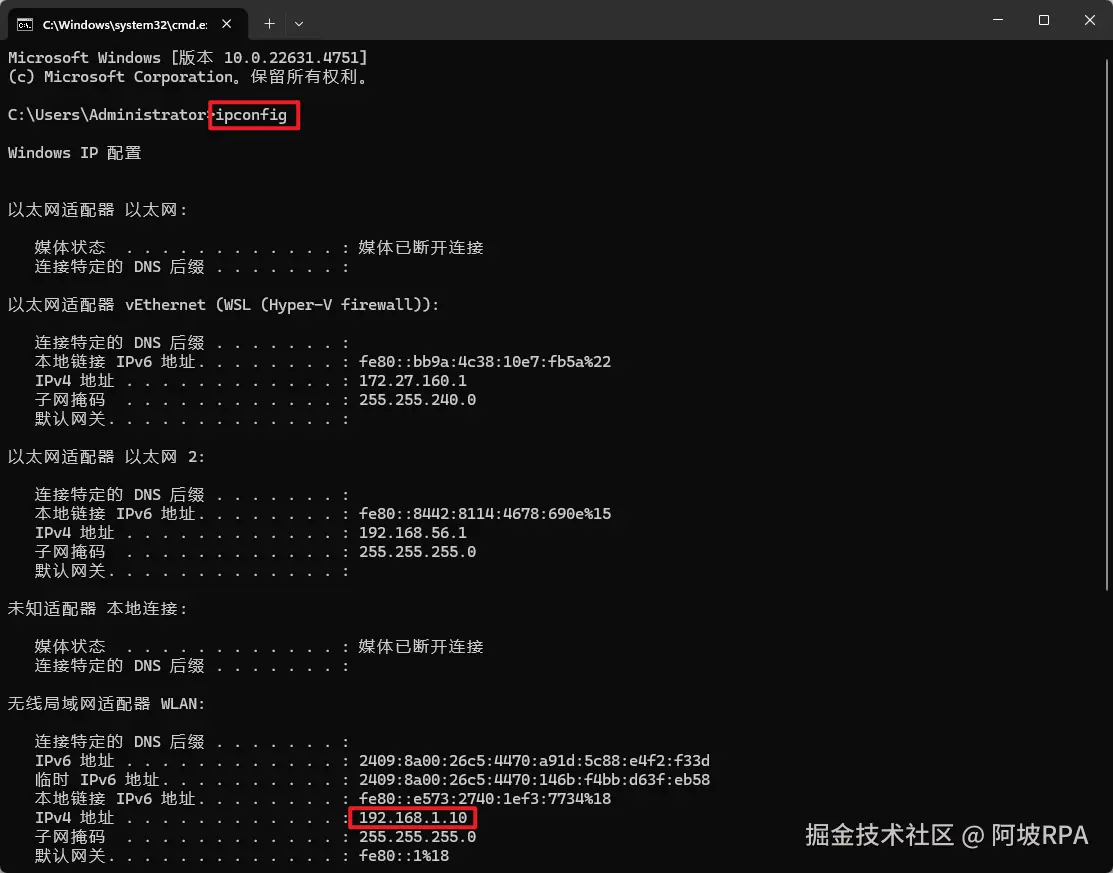 在命令行输入:ipconfig,并找到当前连接的网络适配器(如“无线局域网适配器 WLAN”或“以太网适配器”),下方显示的 IPv4 地址 即为内网IP(如 192.168.x.x 或 10.x.x.x)