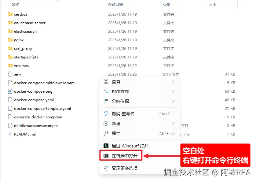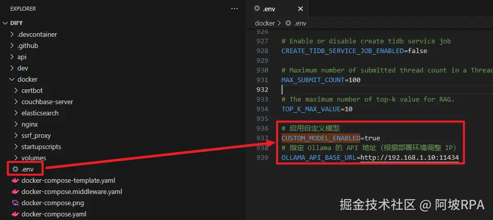 找到dify项目下的docker文件夹并进入,前面已经将.env.example改为了.env文件了,在末尾填上以下配置:
