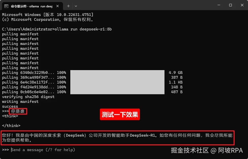 安装完成后,会自动运行大模型,我们输入一个问题测试一下: