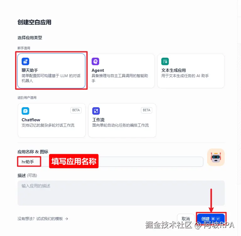 从创建应用页面可以看到,他可以创建:聊天助手,Agent,文生文应用,对话工作流,任务编排工作流等