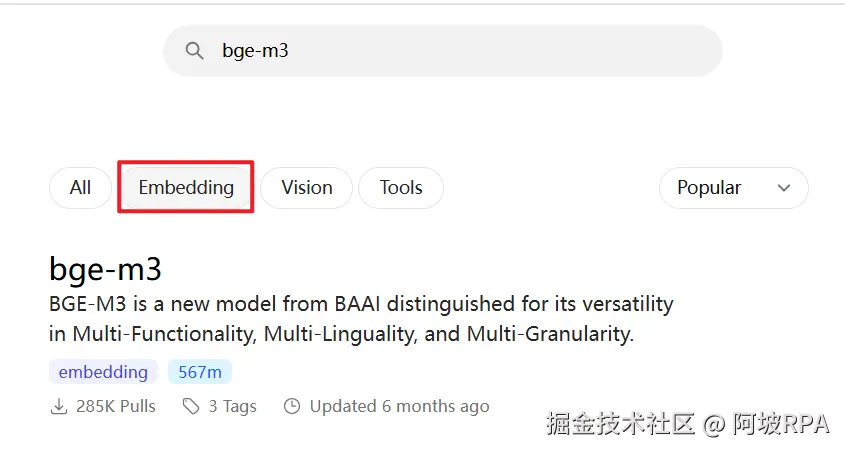 BGE (BAAI General Embedding) 专注于检索增强llm领域,经本人测试,对中文场景支持效果更好,当然也有很多其他embedding模型可供选择,可以根据自己的场景,在ollama上搜索“embedding”查询适合自己的嵌入模型。