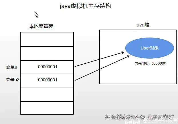 之后 User u2 = u, 将u赋值给变量u2, 也就是将00000001 赋值给u2。这样,变量u、u2指向的就是同一个对象。