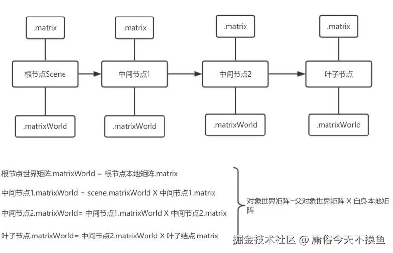 一个模型对象的世界矩阵属性.matrixWorld是自身及其所有父对象本地矩阵属性.matrix的复合矩阵。