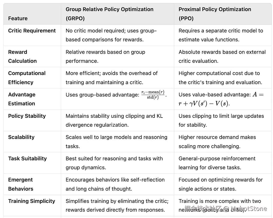 - 无需外部评论者:GRPO 通过对一组回答进行比较,省去了外部评论者模型的需求,降低了计算开销。