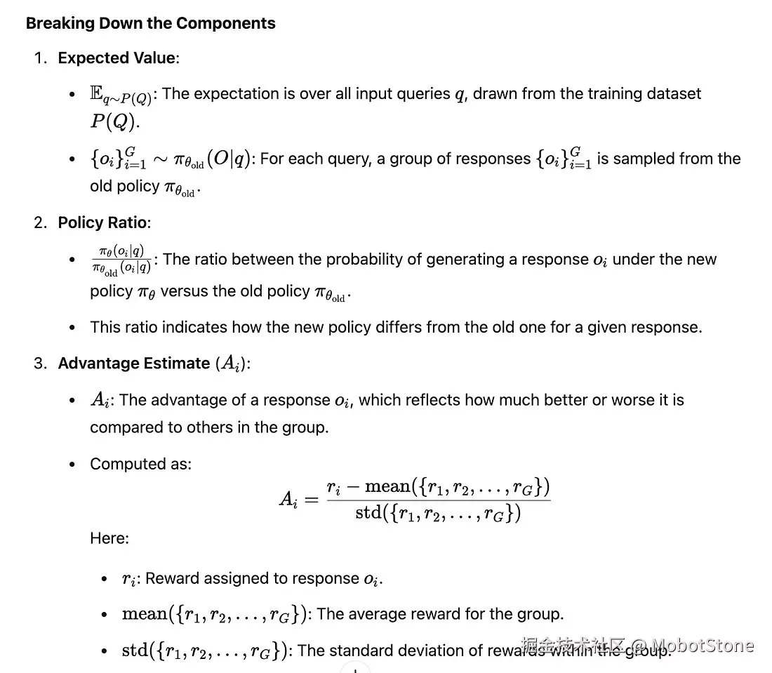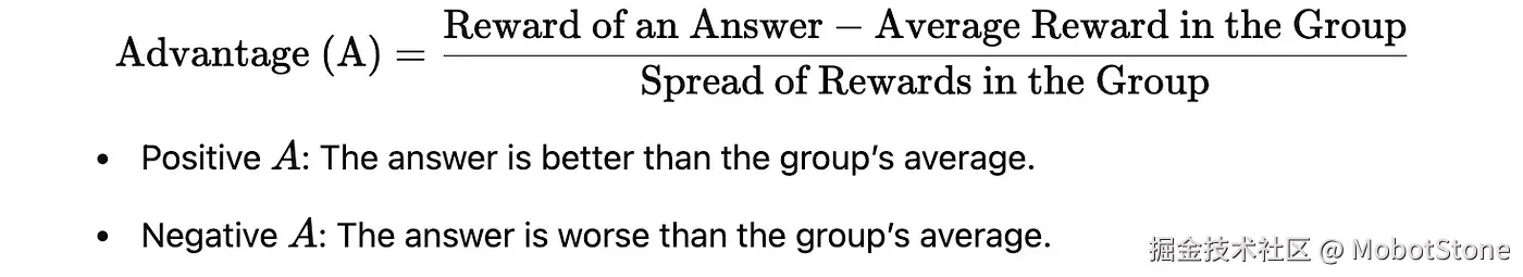 - 我们先比较每个回答和组内其他回答的平均水平:如果某个回答比平均水平好,它就会得到正分;如果差于平均水平,它就得到负分。