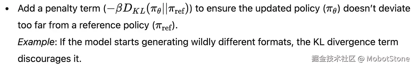 - 举个例子:假如新策略开始过分偏向某个回答,比如 o1,剪切策略会确保它不会因为过度偏向这个回答而影响整体结果。
