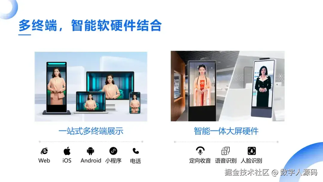 交互式数字人集数字人、AI大脑、定制化声音于一身,以智能硬件载体呈现,如大屏、移动设备、台式机或平板电脑等,创造具有真人般交互能力的虚拟数字人。