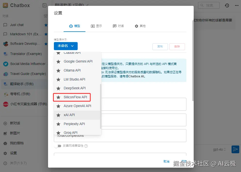 安装 Chatbox,打开软件,进入 设置,找到 Siliconflow API。