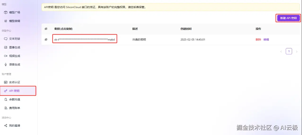 在 硅基流动 平台创建 API 密钥(⚠️ 不要外泄! )。